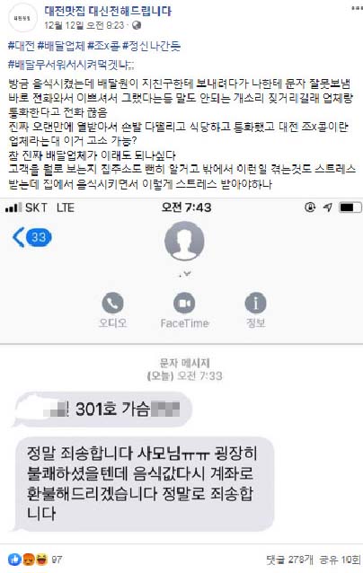 대전 배달대행원 문자에 시민들 분노… 호수·신체비하 담겨