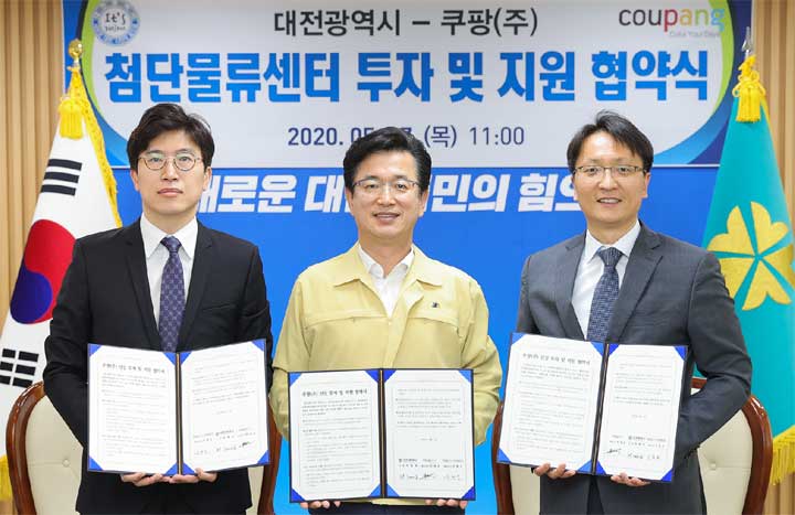 이날 협약으로 쿠팡㈜은 남대전종합물류단지 내 3만 319㎡ 부지에 2021년까지 2년간 600억원을 투자해 첨단 물류센터를 짓게 된다.
