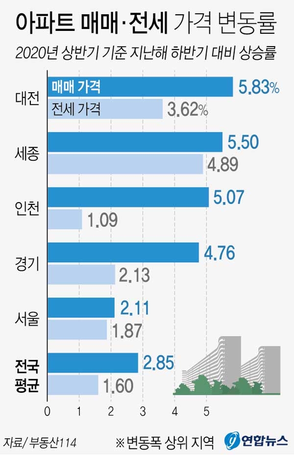 시·도별로 아파트값은 대전(5.83%)이 최대 상승 폭을 기록했다. 이어 세종(5.50%), 인천(5.07%), 경기(4.76%), 서울(2.11%), 부산(1.97%), 충남(1.29%), 울산(1.07%) 등이 뒤를 이었다.