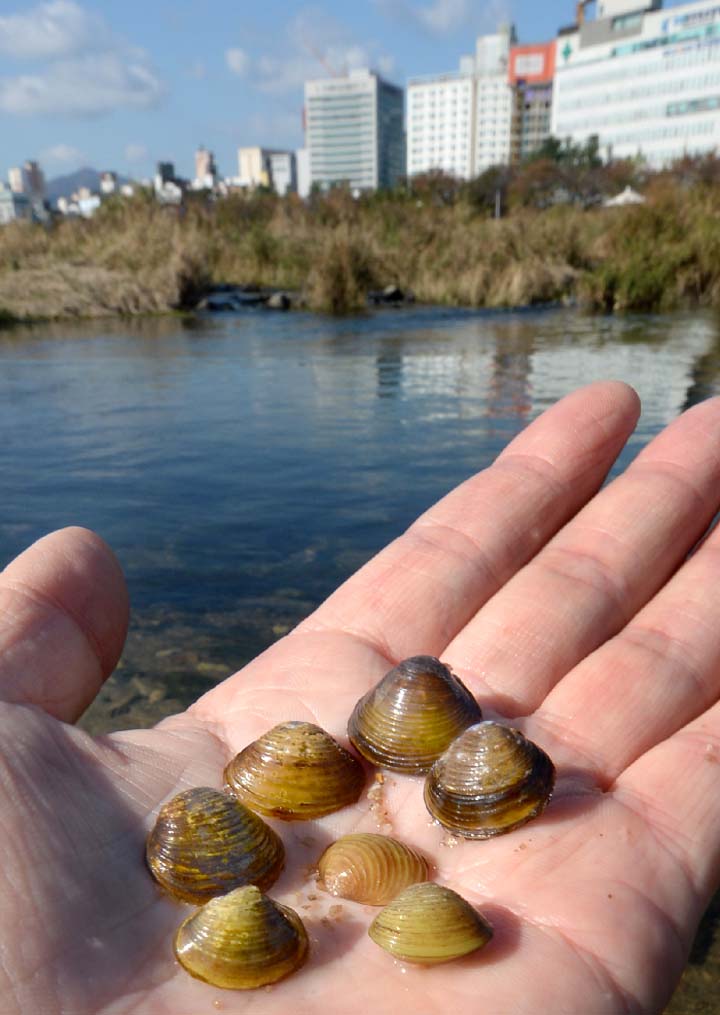 하천 정비로 모래톱을 보기 힘든 도심 속에서 재첩이 다수 발견되는 일은 흔치 않다.