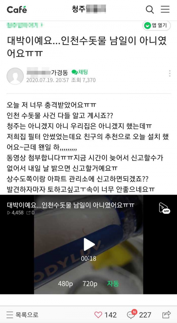 ▲ 19일 네이버의 한 청주맘카페에 올라온 수돗물 유충 발견 글과 동영상. 네이버 캡처