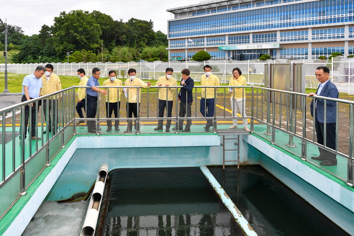 ▲ 청주시의회 의장단, 상임위원장단은 20일 청주시상수도사업본부를 긴급 방문해 수돗물 급수시스템의 안전성과 정수처리 방식을 점검했다. 청주시의회 제공