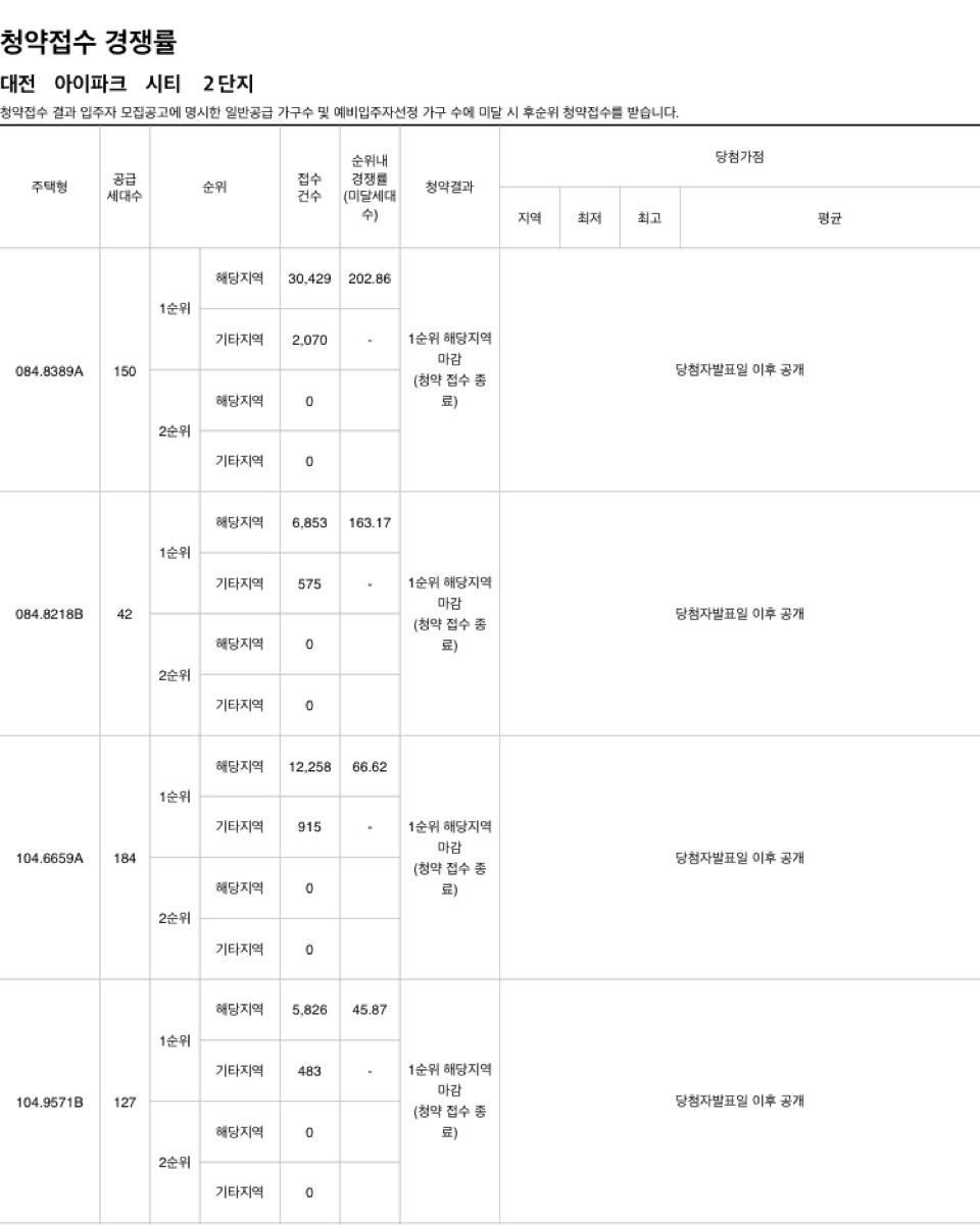 대전 아이파크 시티 1·2단지 최고 청약 경쟁률은 2단지 84㎡ A타입으로 150세대 공급에 3만429명이 신청해 202대 1의 최고 경쟁률을 기록했다.