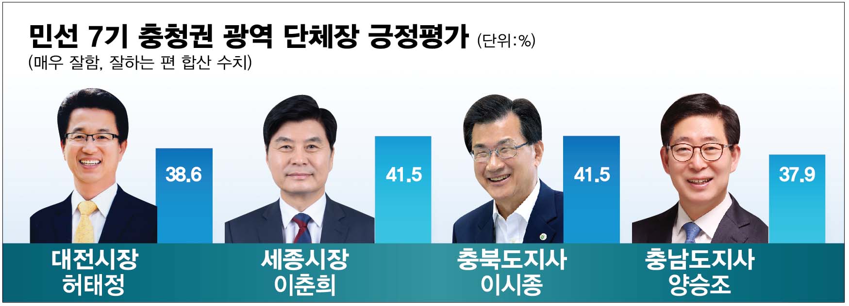 이시종 충북지사도 ‘잘하고 있다’가 41.5%로 ‘잘못하고 있다(37.3%)’는 응답보다 많았다. 양승조 충남지사는 ‘잘못하고 있다’가 38.3%로 ‘잘하고 있다(37.9%)’보다 0.4%p 앞서 긍·부정적인 평가가 팽팽하게 엇갈렸다.